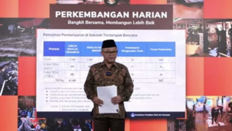 Abdul Mu’ti menjelaskan, total sekolah terdampak mencapai 4.149 unit, dengan rincian 2.756 sekolah di Aceh, 443 sekolah di Sumatra Barat, dan 950 sekolah di Sumatra Utara.