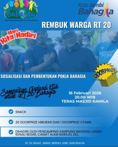 Kegiatan yang akan digelar Senin malam (16/02/2026) pukul 20.00 WIB di Masjid Kamila ini merupakan tindak lanjut Peraturan Wali Kota Jambi Nomor 18 Tahun 2025 tentang Petunjuk Teknis Pelaksanaan Kampung Bahagia, di mana RT 20 ditetapkan sebagai lokasi pelaksanaan periode pertama.